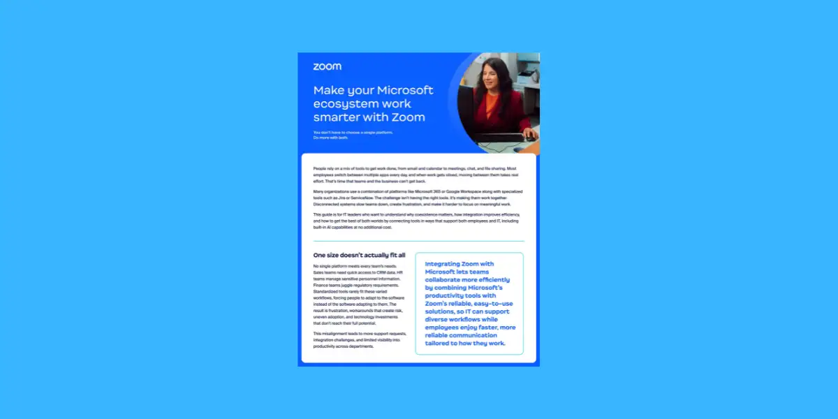 Your teams rely on Microsoft to get work done, but switching between multiple apps can slow collaboration and create frustration. Zoom integrates effortlessly with Teams, Outlook, OneDrive, and SharePoint to create a single, unified workspace...