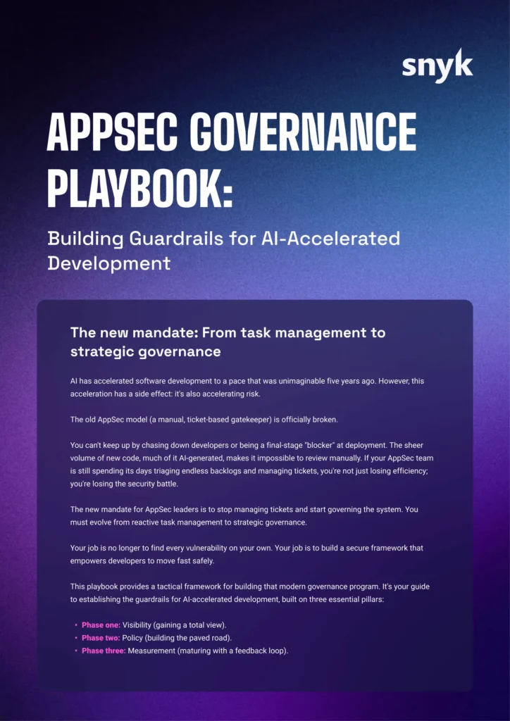 The pace of AI-accelerated development has broken the old AppSec model. You can no longer keep up by chasing down developers or managing endless backlogs. The sheer volume of new code makes manual review impossible, demanding a shift from reactive task management to strategic security governance. This playbook provides a clear, three-phase framework to build the guardrails that empower your developers to move fast—safely and securely.