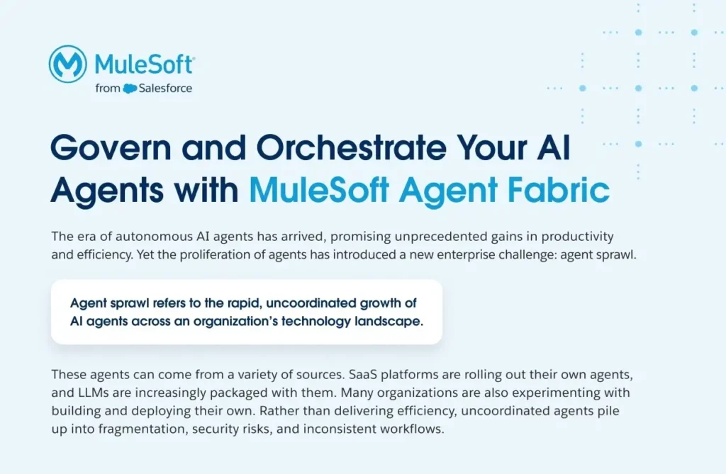 For two decades, MuleSoft has provided the answer to system fragmentation through reusable APIs. Now, we are applying that same expertise to the challenge of AI agent governance. MuleSoft Agent Fabric delivers a unified foundation that transforms uncontrolled, isolated agents into a secure, highly coordinated network.