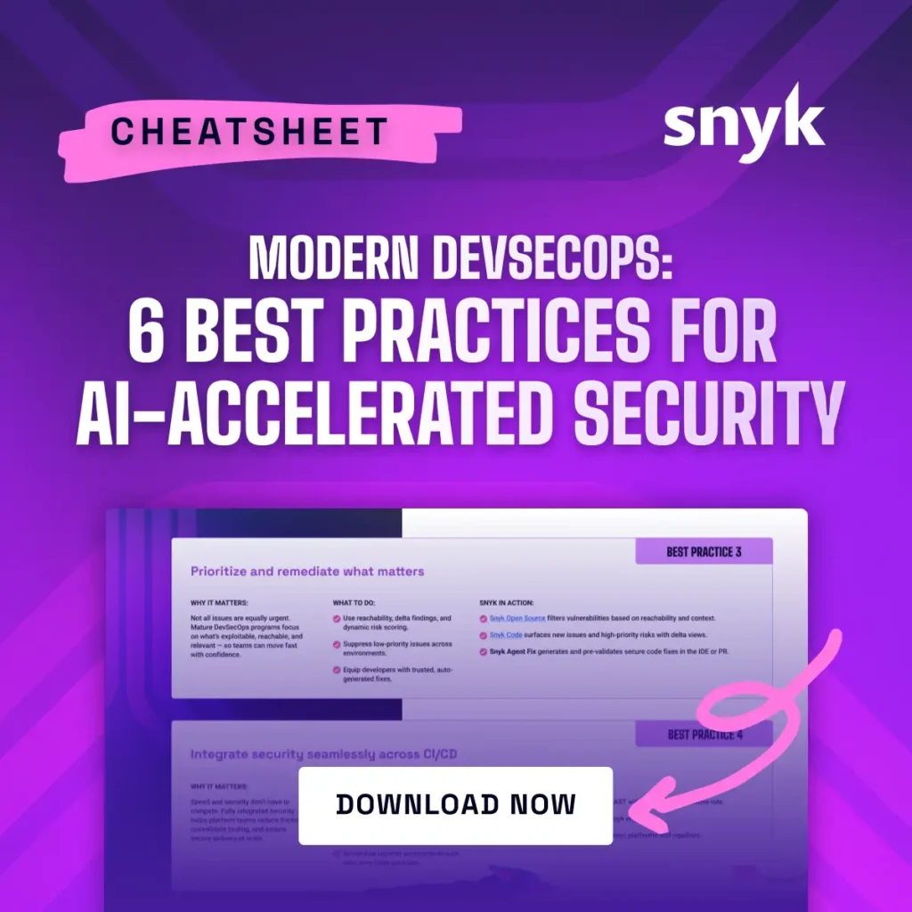 The rapid pace of AI-driven development demands a new approach to DevSecOps. Can your security practices keep up? In this Snyk cheat sheet, discover best practices to modernize your DevSecOps and build a culture of security that scales in the AI era.