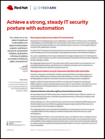 Red Hat and CyberArk’s joint solutions bring together identity security, automation, and modern application development and deployment to help organizations build modern, security-focused applications with cloud portability. In this brief, discover how automation can enhance overall IT security and improve operational efficiency without impeding DevOps, SecOps, or ITOps.